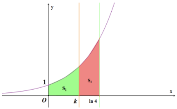 Cho hình thang cong $(H)$ giới hạn bởi các đường $y = e^{x}$, $y = 0$, $x = 0$, $x = \ln 4$. Đường thẳng $x = k$ ($0 < k < \ln 4$) chia $(H)$ thành hai phần có diện tích là $S_{1}$ và $S_{2}$ như hình vẽ bên. Tìm $k$ để $S_{1} = 2S_{2}$. (làm tròn kết quả đến hàng phần mười)