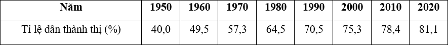 Cho bảng số liệu: TỈ LỆ DÂN THÀNH THỊ KHU VỰC MỸ LATINH GIAI ĐOẠN 1950 – 2020 (Nguồn: WB,