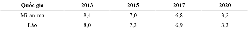 Cho bảng số liệu: TỐC ĐỘ TĂNG GDP CỦA MI-AN-MA VÀ LÀO, GIAI ĐOẠN 2013 - 2020 (Đơn vị: