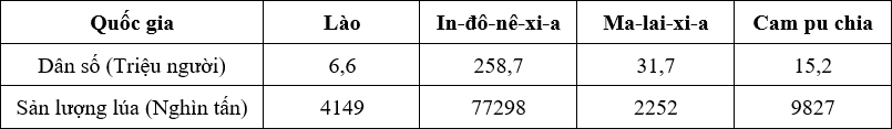 Cho bảng số liệu: SẢN LƯỢNG LÚA VÀ DÂN SỐ CỦA MỘT SỐ QUỐC GIA, NĂM 2019 Quốc gia (Nguồn: