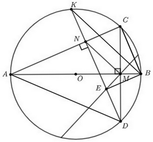 Cho đường tròn (O) đường kính AB và điểm M thuộc đoạn thẳng OB (M khác O và B). Đường thẳng qua M vuông góc với AB cắt đường tròn (O) tại hai điểm C, D. Đường thẳng qua D vuông góc với AC cắt AC tại N và cắt đường tròn (O) tại K (K khác D).