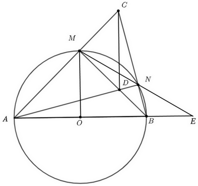 Cho đường tròn tâm O đường kính AB và M là điểm chính giữa của cung AB. Lấy điểm D thuộc dây MB (D khác M và B ). Tia AD cắt cung nhỏ BM tại N, tia AM cắt tia BN tại C.
