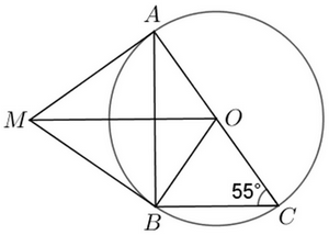 Từ điểm \(M\) nằm ngoài đường tròn tâm \(O\) đường kính \(AC,\)vẽ hai tiếp tuyến \(MA,{\mkern 1mu} MB\) với đường tròn \(\left( {A,B} \right.\) là các tiếp điểm) và \(\angle ACB = 55^\circ \) (minh họa như hình bên dưới).