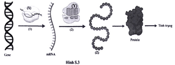 Hình S .3 mô tả quan hệ giữa gene và tính trạng. Trên hình, các số (1), (2) tương ứng với hai cơ chế di truyền ở cấp phân từ; (X), (Y), (Z) là các phân từ hữu cơ hoặc bào quan trong tế bào.