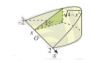 Khi cắt một vật thể hình chiếc nêm bởi mặt phẳng vuông góc với trục $Ox$ tại điểm có hoành độ $x$ ($-2 \le x \le 2$), mặt cắt là tam giác vuông có một góc $45^\circ$ và độ dài một cạnh góc vuông là $\sqrt{14 - 3x^2}$ (như hình vẽ). Tính thể tích vật thể hình chiếc nêm trên.