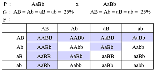| c) Khi cho lai giữa cơ thể bố mẹ có kiểu gene dị hợp, đời con thu được tỉ lệ kiểu hình 9 tím : 7 trắng. | ||