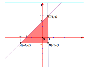 Cho $x, y$ thỏa mãn hệ bất phương trình $\left\{\begin{array}{c}x-1 \leq 0 \\ y+1 \geq 0 \\ x-y+3 \geq 0\end{array}\right.$, các đường thẳng: $d_1: x-1=0$; $d_2: y+1=0$; $d_3: x-y+3=0$ và biểu thức $M=2 x+y$. Xét tính đúng sai của các mệnh đề: