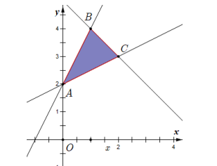 Cho biểu thức $F=y-x$ trên miền xác định bởi hệ $\left\{\begin{array}{l}y-2 x \leq 2 \\ 2 y-x \geq 4 \\ x+y \leq 5\end{array}\right.$. Xét tính đúng sai của các mệnh đề: