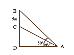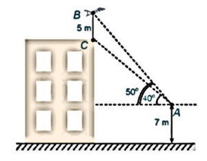 Trên nóc một tòa nhà có một cột ăng-ten cao 5m . Từ một vị trí quan sát A cao 7m so với mặt đất có thể nhìn thấy đỉnh B và chân C của cột ăngten, với các góc tương ứng là $50^{\circ}$ và $40^{\circ}$ so với phương nằm ngang. Tính chiều cao của tòa nhà.