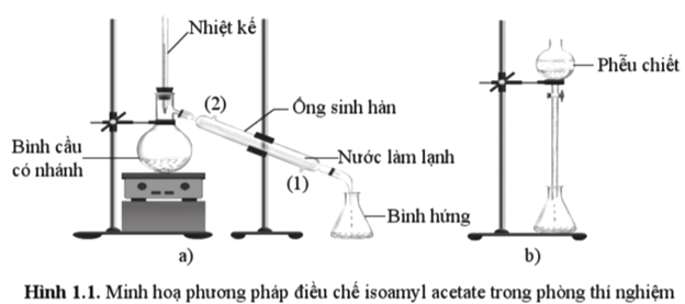 1) Hỗn hợp chất lỏng trước phản ứng trong bình cầu có nhánh gồm isoamyl alcohol, acetic acid và sulfuric acid đặc.