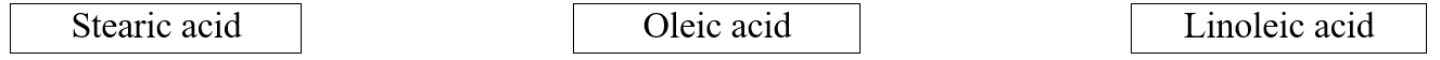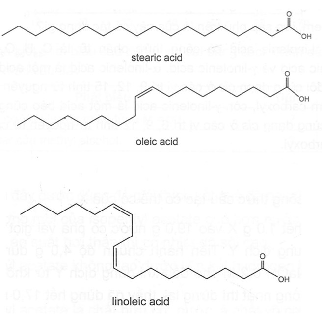Acid béo là thành phần quan trọng của một chế độ ăn uống lành mạnh. Acid béo thiết yếu là những acid béo cơ thể con người không thể tự tổng hợp ra (acid omega-3 và acid omega-6). Cho biết các acid béo như stearic acid; oleic acid và linoleic acid với công thức thu gọn nhất được biểu diễn dưới đây: