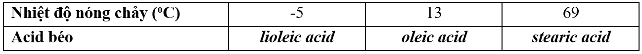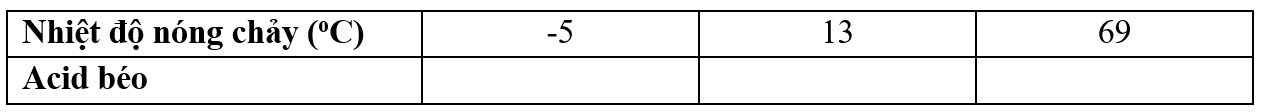 3. Biết nhiệt độ nóng chảy của các acid béo trên theo thứ tự ngẫu nhiên lần lượt là -5oC; 13oC và 69oC. Hãy điền tên acid béo vào bảng sau sao cho phù hợp: