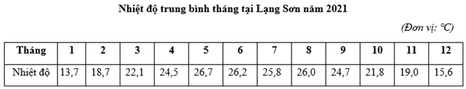 Căn cứ vào bảng số liệu trên, tính tổng nhiệt độ các tháng tại Lạng Sơn năm 2021. (Làm tròn kết quả đến hàng đơn vị của ℃).