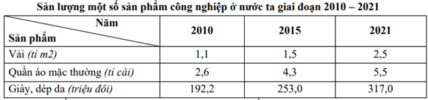 | d) Để thể hiện quy mô một số sản phẩm công nghiệp ở nước ta giai đoạn 2010 – 2021, biểu đồ cột là thích hợp nhất. |