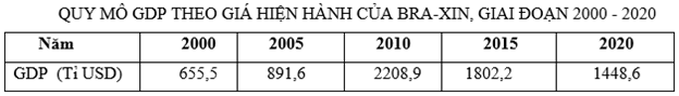 Căn cứ vào bảng số liệu trên, tính tốc độ tăng trưởng GDP của Bra-xin năm 2015. Lấy năm 2000 là năm gốc. (Làm tròn đến kết quả hàng đơn vị của %)