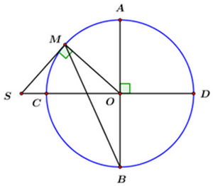Cho đường tròn (O) và hai đường kính AB, CD vuông góc với nhau. Lấy một điểm M trên cung AC rồi vẽ tiếp tuyến với đường tròn (O) tại M. Tiếp tuyến này cắt đường thẳng CD tại S. Chứng minh rằng: \(\angle MSD = 2.\angle MBA\)