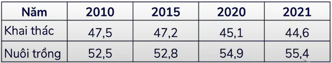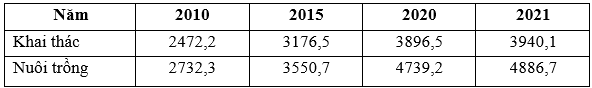 Cho bảng số liệu về sản lượng thuỷ sản khai thác và nuôi trồng của nước ta giai đoạn 2010 – 2021 (Đơn vị: Nghìn tấn)