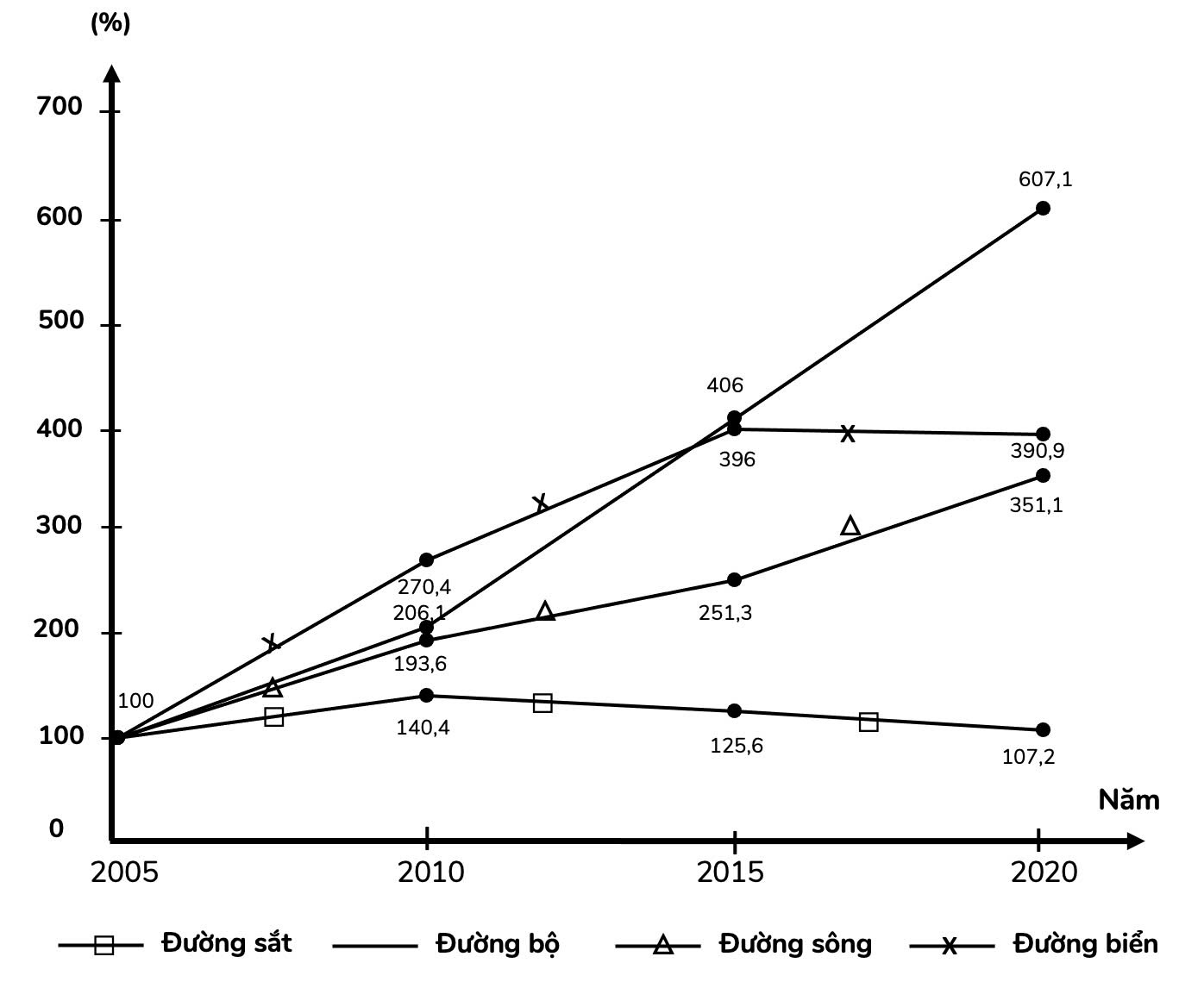 Biểu đồ dưới đây thể hiện nội dung nào về khối lượng hàng hóa vận chuyển phân theo loại hình vận tải của nước ta giai đoạn 2005 – 2020?