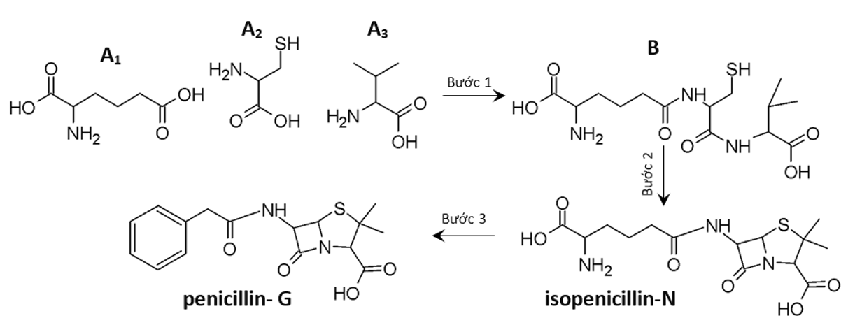 Có 3 bước chính và quan trọng trong việc sinh tổng hợp ra penicillin- G (benzylpenicillin). Bước thứ nhất là trùng ngưng 3 amino acid là α-aminoadipic acid (A1), cysteine (A2) và valine (A3) thành tripeptide (B). Bước thứ hai trong sinh tổng hợp penicillin-G là chuyển đổi oxy hóa ACV mạch thẳng thành isopenicillin-N trung gian có 2 vòng bởi enzym isopenicillin-N-synthase (IPNS), được mã hóa bởi gen pcbC. Isopenicillin-N là một chất trung gian rất yếu, do nó không thể hiện hoạt động kháng khuẩn mạnh. Bước cuối cùng là sự chuyển hóa amine bởi enzyme isopenicillin-N,N-acyltransferase, trong đó gốc α-aminoadipyl bên cạnh chuỗi của isopenicillin-N bị loại bỏ và thay cho chuỗi phenylacetyl. Phản ứng này được điều khiển bởi gen penDE, là duy nhất trong quá trình tạo penicillin.