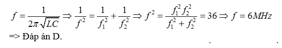Một mạch dao động LC lí tưởng gồm cuộn cảm thuần có độ tự cảm không đổi, tụ điện có điện dung C thay đổi. Khi C = C1 thì tần số dao động riêng của mạch là 7,5 MHz và khi C = C2 thì tần số dao động riêng của mạch là 10 MHz. Nếu C = C1 + C2 thì tần số dao động riêng của mạch là