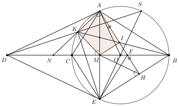Cho đường tròn (O) với đường kính BC. Trên tia đối của tia CB lấy điểm D, gọi DA là tiếp tuyến của đường tròn (O) với A là tiếp điểm. Kẻ đường thẳng qua A vuông góc với BC tại M và cắt đường tròn (O) tại E (E khác A). Gọi AH là đường cao của tam giác ABE, AH cắt BC tại F. Gọi I là trung điểm của đoạn AH, đường thẳng BI cắt đường tròn (O) tại K (K khác B), AK cắt BD tại N.