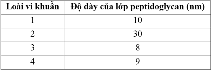 Bảng 1. Kết quả đo độ dày của lớp peptidoglycan của một số loài vi khuẩn