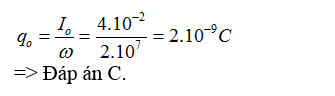Một mạch dao động gồm một tụ điện có điện dung C và cuộn cảm L. Điện trở thuần của mạch R = 0. Biết biểu thức của dòng điện qua mạch là i = 4.10-2cos(2.107t)(A). Điện tích cực đại là