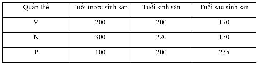 Cho biết diện tích cư trú của ba quần thể này bằng nhau, khả năng cung cấp nguồn sống của môi trường cho ba quần thể này là như nhau. Phân tích bảng số liệu trên, phát biểu nào sau đây đúng?