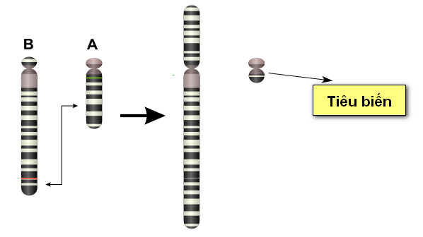 Chuyển đoạn Robertson: Đây là trường hợp hình thành NST tâm giữa do sự nối lại của 2 NST. Chuyển đoạn thuận nghịch được thực hiện giữa 2 NST tâm đầu A và B, khi A bị đứt phía dưới tâm động tạo vai dài mất tâm động, còn B bị đứt ở đầu mút ngắn trên tâm động, 2 đoạn nối nhau tạo NST tâm đều mang tâm động của B. Đoạn có tâm động A với vai ngắn nối với đoạn ngắn của B hình thành NST con có tâm động A. NST con mới có nhiều chất dị nhiễm sắc không quan trọng nên thường mất đi. Chuyển đoạn Robertson có hậu quả làm giảm số lượng NST.