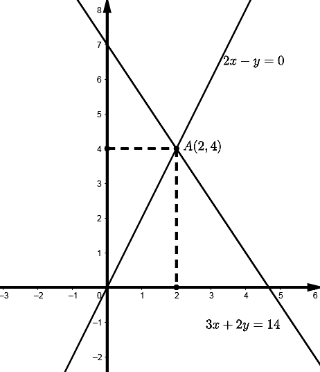 c) Vẽ hai đường thẳng \(2x - y = 0\) và \(3x + 2y = 14\) trên cùng một mặt phẳng tọa độ để minh họa kết luận ở câu b).