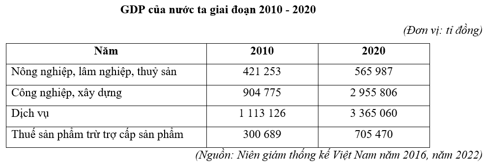 Cho bảng số liệu sau: Năm 2020 GDP ngành dịch vụ lớn hơn gấp bao nhiêu lần so