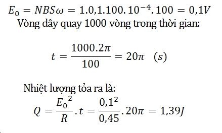 = 100 rad/s trong một từ trường đều có cảm ứng từ B = 0,1 T xung quanh một trục nằm trong mặt phẳng vòng dây và vuông góc với các đường sức từ. Nhiệt lượng tỏa ra trong vòng dây khi nó quay được 1000 vòng là: