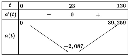 Kinh viễn vọng không gian Hubble được đưa vào vũ trụ ngày \(24 / 4 / 1990\) bằng tàu con thoi Discovery. Vận tốc của tàu con thoi trong sứ mệnh này, từ lúc cất cánh tại thời điểm \(t=0(s)\) cho đến khi tên lửa đẩy được phóng đi tại thời điểm \(t=126(\mathrm{~s})\) cho bởi hàm số sau đây: \(v(t)=0,001302 t^3-0,09029 t^2+23,(\mathrm{v}\) được tính bằng \(\mathrm{ft} / \mathrm{s}, 1\) feet \(=0,3048 \mathrm{~m})\). Gọi \((a ; b)\) là khoảng thời gian gia tốc của tàu con thoi sẽ tăng tính từ thời điểm cất cánh cho đến khi tên lửa đẩy được phóng đi. Tính \(T=a+b\) ?