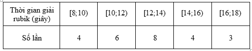 Dũng là học sinh rất giỏi chơi rubik, bạn có thể giải nhiều loai khối rubik khác nhau. Trong một lần tập luyện giải khối rubik \(3 \times 3\), bạn Dũng đã tự thống kê lại thời gian giải rubik trong 25 lần giái liên tiếp ở bảng sau: