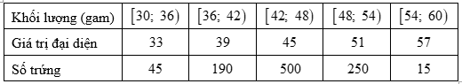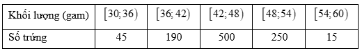 Một trang trại phân \(1000\) quả trứng thành \(5\) loại, tuỳ theo khối lượng (đã được làm tròn) của chúng được thống kê bởi bảng dưới đây: