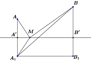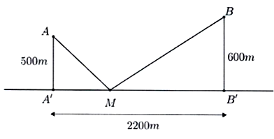 Cả hai xã \(A,B\) cùng ở một bên bờ sông Cấm, khoảng cách từ hai xã đó đến bờ sông lần lượt là \(AA' = 500\;{\rm{m}},BB' = 600\;{\rm{m}}\) và người ta đo được \(A'B' = 2200\;{\rm{m}}\) (Hinh vẽ). Các kĩ sư muốn xây một trạm cung cấp nước sạch nằm bên bờ sông Cấm cho người dân hai xã. Để tiết kiệm chi phí, các kĩ sư cần phải chọn vị trí \(M\) của trạm cung cấp nước sạch đó trên đoạn \(A'B'\) sao cho tổng khoảng cách từ hai xã đến vị trí \(M\) là nhỏ nhất. Giá trị nhỏ nhất của tổng khoảng cách đó có dạng \(a\sqrt b (a,b \in \mathbb{R})\). Tính \(a - 20b\).