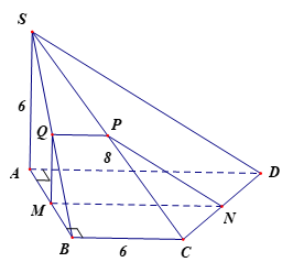 Cho hình chóp \(S.ABCD\) với đáy \(ABCD\) là hình thang vuông tại \(A\), đáy lớn \(AD = 8\), đáy nhỏ \(BC = 6\), \(SA\) vuông góc với đáy, \(SA = 6\). Gọi \(M\) là trung điểm \(AB\), \(\left( P \right)\) là mặt phẳng qua \(M\) và vuông góc với \(AB\) cắt \(CD,SC,SB\) lần lượt tại \(N,P,Q\). Hãy xác định tính ĐÚNG – SAI trong các phát biểu sau: