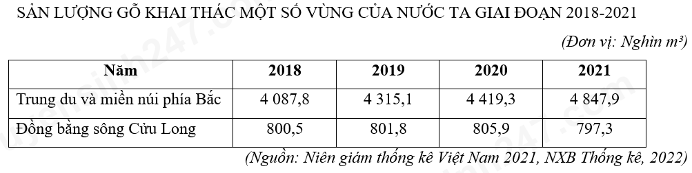 Theo bảng số liệu, tính tốc độ tăng trưởng khai thác gỗ của đồng bằng sông Cửu Long năm 2021 so với năm 2018. (lấy kết quả làm tròn đến số thập phân thứ nhất của %)