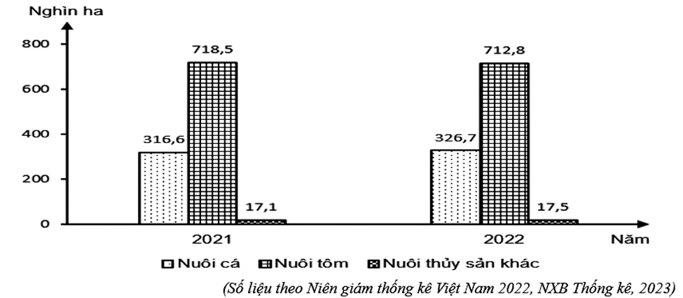 Cho biểu đồ về diện tích thu hoạch thủy sản nội địa của nước ta năm 2021 và năm 2022: