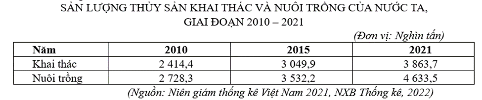Theo bảng số liệu, cho biết tỉ trọng thủy sản khai thác của nước ta năm 2021 nhỏ hơn tỉ trọng thủy sản nuôi trồng bao nhiêu %. (Làm tròn kết quả đến chữ số thập phân thứ nhất của %)