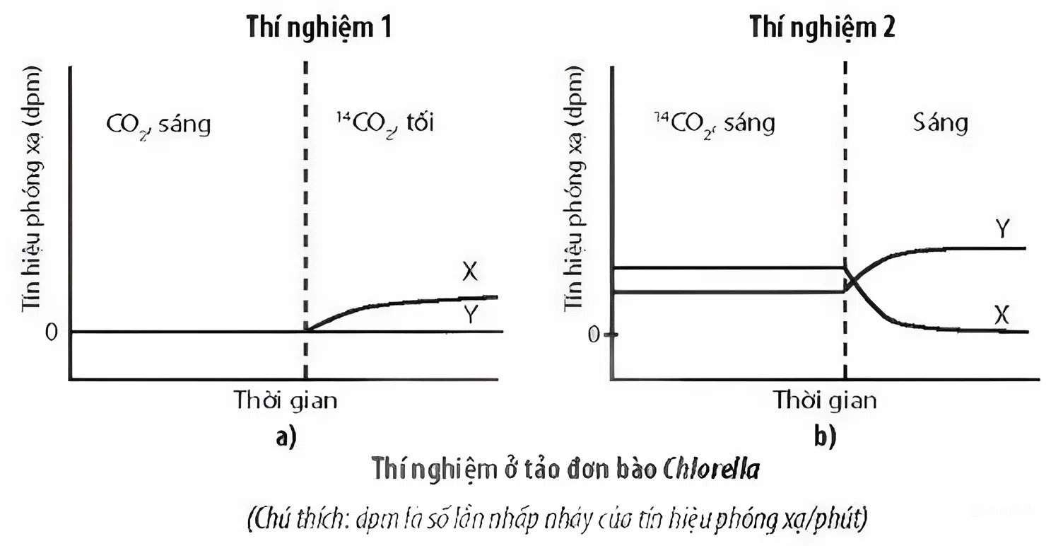 Tảo đơn bào Chlorella được sử dụng để nghiên cứu sự có mặt của carbon đồng vị phóng xạ (14C) có trong hai hợp chất hữu cơ X và Y thuộc chu trình Calvin bằng cách bổ sung 14CO2 vào môi trường nuôi cấy Chlorella và đo tín hiệu phóng xạ trong hai thí nghiệm sau: