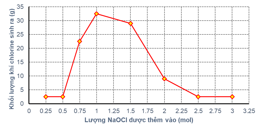Sản phẩm phụ được biết đến của phản ứng giữa thuốc tẩy và ammonia là khí chlorine (Cl2). Khí chlorine có tác dụng mạnh có mùi khó chịu, xốc và rất độc. Xác định lượng thuốc tẩy và ammonia khi trộn lẫn với nhau, tạo ra khí chlorine, một lượng thuốc tẩy khác nhau được thêm vào 8 dung dịch ammonia 1M được sử dụng với thể tích như nhau. Dung dịch và khí chlorine thu được từ mỗi hỗn hợp đã được thu thập và đo lường. Một lượng NaClO được thêm vào từng ống dung dịch; lượng thêm vào được tăng dần cho mỗi thử nghiệm. Khối lượng khí chlorine sinh ra trong mỗi lần thử nghiệm được ghi lại và được biểu thị trong Hình 1.