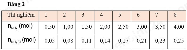 Dựa vào kết quả thí nghiệm 3, nồng độ NH3 tăng từ 0,50 lên 4,00 mol, mức tăng lớn nhất lượng NH2Cl sinh ra xảy ra: