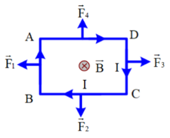 Cho một khung dây cứng hình chữ nhật ABCD có AB = 15 cm; BC = 25cm, có dòng điện I = 5A chạy qua đặt trong một từ trường đều có các đường cảm ứng từ vuông góc với mặt phẳng chứa khung dây và hướng từ ngoài vào trong như hình vẽ. Biết B = 0,02T. Độ lớn lực từ tác dụng lên cạnh AB, BC, CD và DA lần lượt là \({F_1},{F_2},{F_3}\) và \({F_4}\). Chọn phương án đúng.