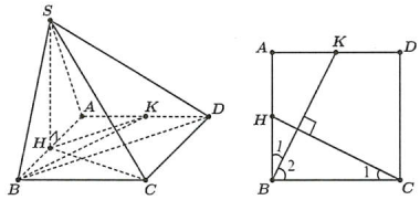 Cho hình chóp \(S.ABCD\) có đáy \(ABCD\) là hình vuông. Gọi \(H\) là trung điểm của \(AB\) và \(SH \bot \left( {ABCD} \right)\). Gọi \(K\) là trung điểm của \(AD\). Tính góc giữa \(BK,\,\,SC\)