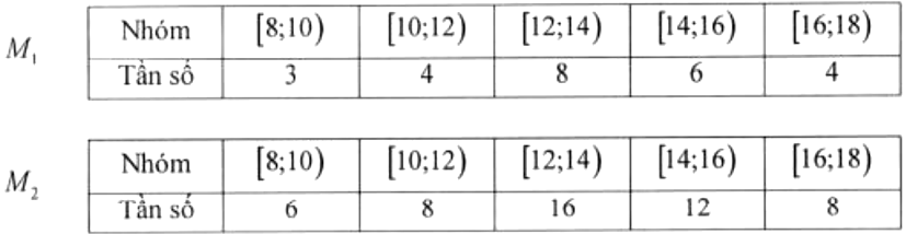 Hai mẫu số liệu ghép nhóm \({M_1},{M_2}\) có bảng tần số ghép nhóm như sau: