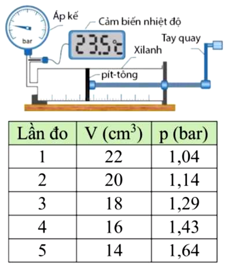 | b) Với kết quả thu được ở bảng bên, công thức liên hệ áp suất theo thể tích là \(p = \dfrac{{23}}{V},p\) đo bằng bar \(\left( {1{\rm{bar}} = {{10}^5}\;{\rm{Pa}}} \right),V\) đo bằng \({\rm{c}}{{\rm{m}}^3}\). | ||