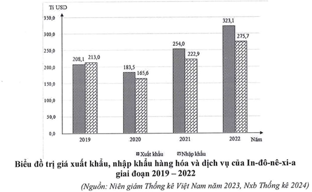 | b) Từ năm 2019 đến năm 2022, In-đô-nê-xi-a có cán cân thương mại xuất siêu. | ||