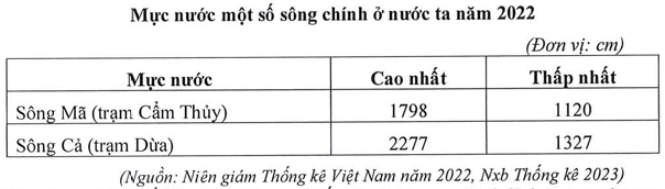 Căn cứ vào bảng số liệu trên, hãy cho biết năm 2022, sự chênh lệch mực nước cao nhất và mực nước thấp nhất của sông Cả tại trạm Dừa cao hơn so với sự chênh lệch mực nước cao nhất và mực nước thấp nhất của sông Mã tại trạm Cẩm Thủy là bao nhiêu cm.