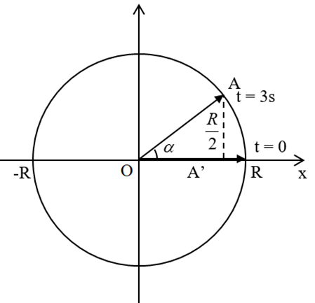 Trên thực tế, sau khi đạn va chạm với vật, đạn sẽ dính vào trong vật và sau đó chúng sẽ thực hiện một dao động điều hòa (bỏ qua mọi ma sát). Mỗi dao động điều hòa lại có thể coi là hình chiếu của 1 chuyển động tròn đều lên phương đường kính. Cho chất điểm A chuyển động tròn đều trên đường tròn bán kính R. Gọi A’ là hình chiếu của A trên một đường kính của đường tròn này. Tại thời điểm t = 0 ta thấy hai điểm này gặp nhau, đến thời điểm t’ = 3 s ngay sau đó khoảng cách giữa chúng bằng một nửa bán kính. Tần số của chuyển động tròn đều của A là ________ Hz.